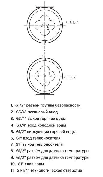 - Две гильзы для температурных датчиков, позволяющие измерять температуру на разных уровнях в бойлере;